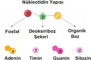 Bir nükleotid, şeker fosfat ve azotlu organik bazdan oluşur.