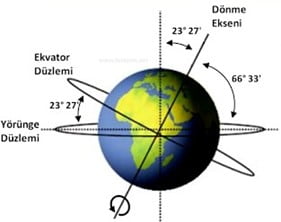 - Dünya’nın Güneş etrafındaki dönme ekseni ile yörünge düzlemi arasında 23° 27′ (Yaklaşık 23.5°) lik açı vardır.