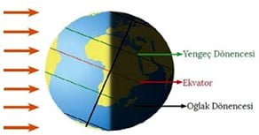- Dünya, Güneş etrafında dönerken bu eğiklikten dolayı, kuzey ve güney yarım küre farklı zamanlarda farklı ışık alır.