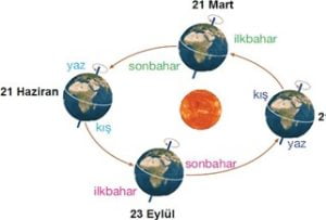 Not: Dünya yüzeye düşen ışık miktarının (enerjinin) fazla olması yaz mevsiminin yaşanırken, ışık miktarının azalması sonucu kış mevsimi yaşanır.